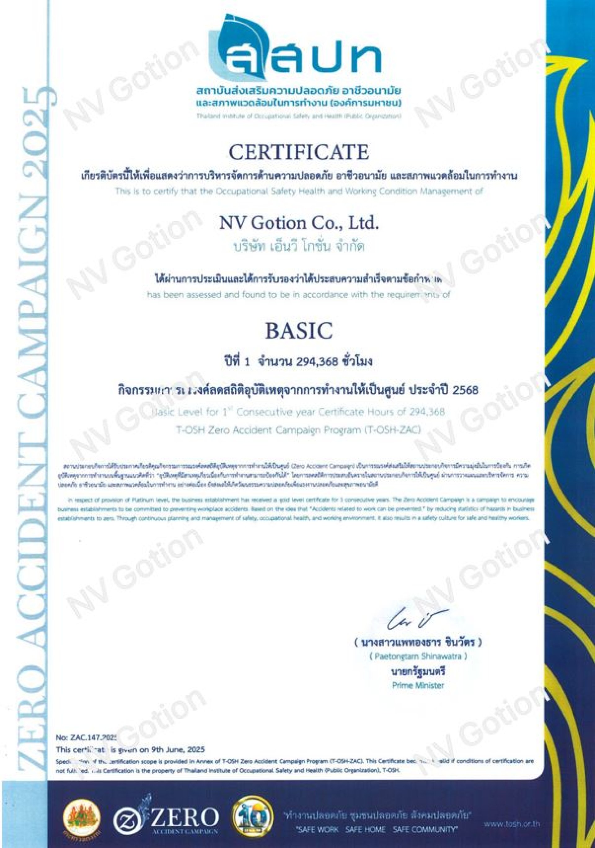 NV Gotion Co., Ltd. has successfully passed the evaluation and received certification for meeting the criteria of the Zero Workplace Accident Campaign for the year 2025 (Year 1st), with a cumulative total of 294,368 work hours without any lost-time incidents.
